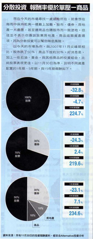 第三個圖:50%股票,30%債券,10%商品;10%房地產,右側為報酬率:1年:-23.1%;五年: